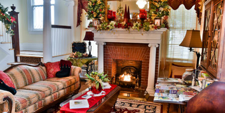 There are several common spaces that guests enjoy gathering together. In the winter, guests gather in the parlor and living room to warm themselves by the fireplaces. In the spring, summer, and fall, the porch is the go-to spot. It will be a tough choice between the swing, the reading chairs, love seat, or porch sofa. And, of course, the other hot spots on the property include the “Parrot Head” Adirondack lounging spot with palm tree overhead or the “Swammock” (guest-appointed name) — the combination swing/hammock perched in the beautiful perennial garden.